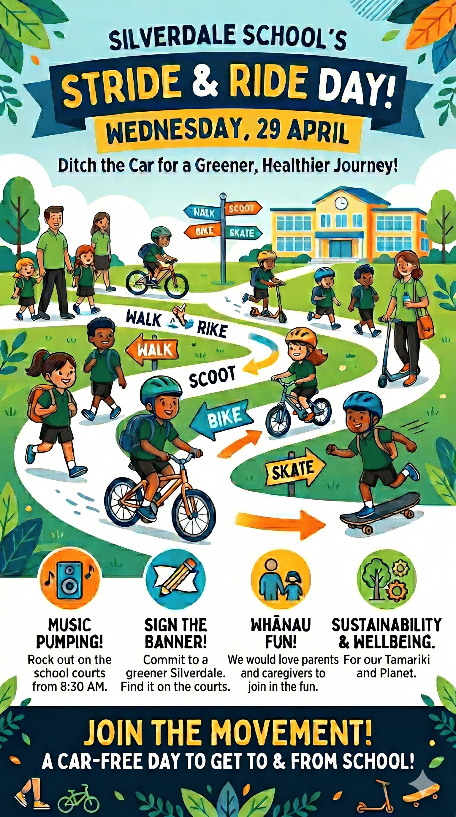 At Silverdale, we are committed to sustainability and the wellbeing of our tamariki. This event is all about encouraging our community to ditch the car for a morning and afternoon and find a more active way to get to school. Whether you choose to walk, scoot, bike, or even skate, we want to see you moving.